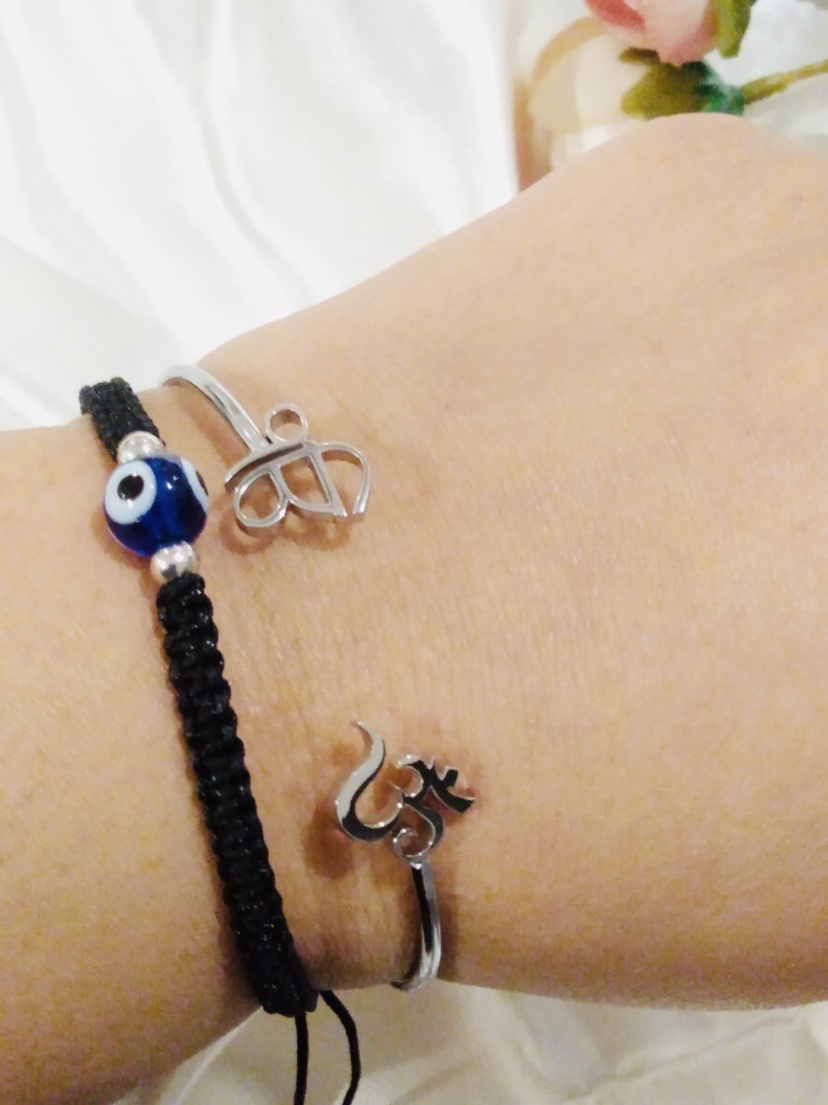 Twist-style bangle with an Om' motif on one side and 'Khanda' motif on the other. Guruji Swaroop blessings to protect you from all negative energy, is a symbol of Purity, knowledge, success and Prosperity. Guruji Bracelets remove negative energy and and uplift the spiritual, mental and physical Health. Easy to wear, Skin Friendly. You can Gift this Beautiful Bracelet to your family, friends, relative, neighbor on religious occasion like : pooja, kirtan, return gift idea, housewarming, home inauguration, Puja and other occasions.