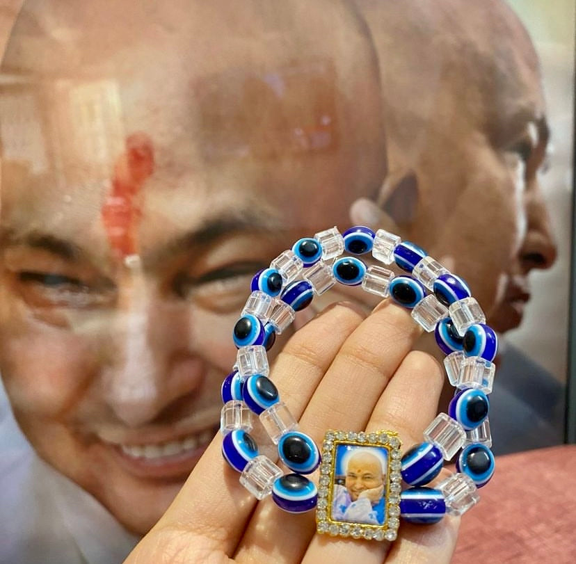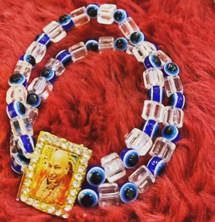 Jai Guruji swaroop bracelets with Evil eye and crystal beads. Carry Guruji's blessings with you wherever you go with our elegant Guruji swaroop bracelets. These bracelets are not just accessories; they are a symbol of your connection to the divine.Immerse yourself in the divine energy of Guruji through our carefully curated collection.