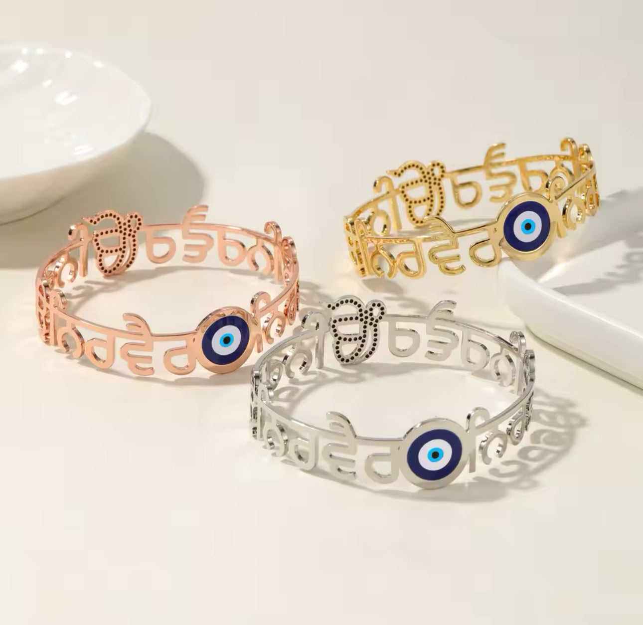 Introducing the Nirvana Nirvair Bangle, a beautiful and culturally inspired piece featuring sparkling zirconia. Elevate your style with this unique design, fusing tradition with modernity. Expertly crafted, this bangle is a must-have for anyone seeking a stunning and meaningful accessory. The concept of nirbhau nirvair, which means being without fear and without hate. This idea promotes a peaceful and fearless mindset, allowing individuals to live without the burden of negative emotions. This beautiful bangle also features Evil eye 🧿 on one side and Ek Onkar on the other side giving you the best protection at all times.