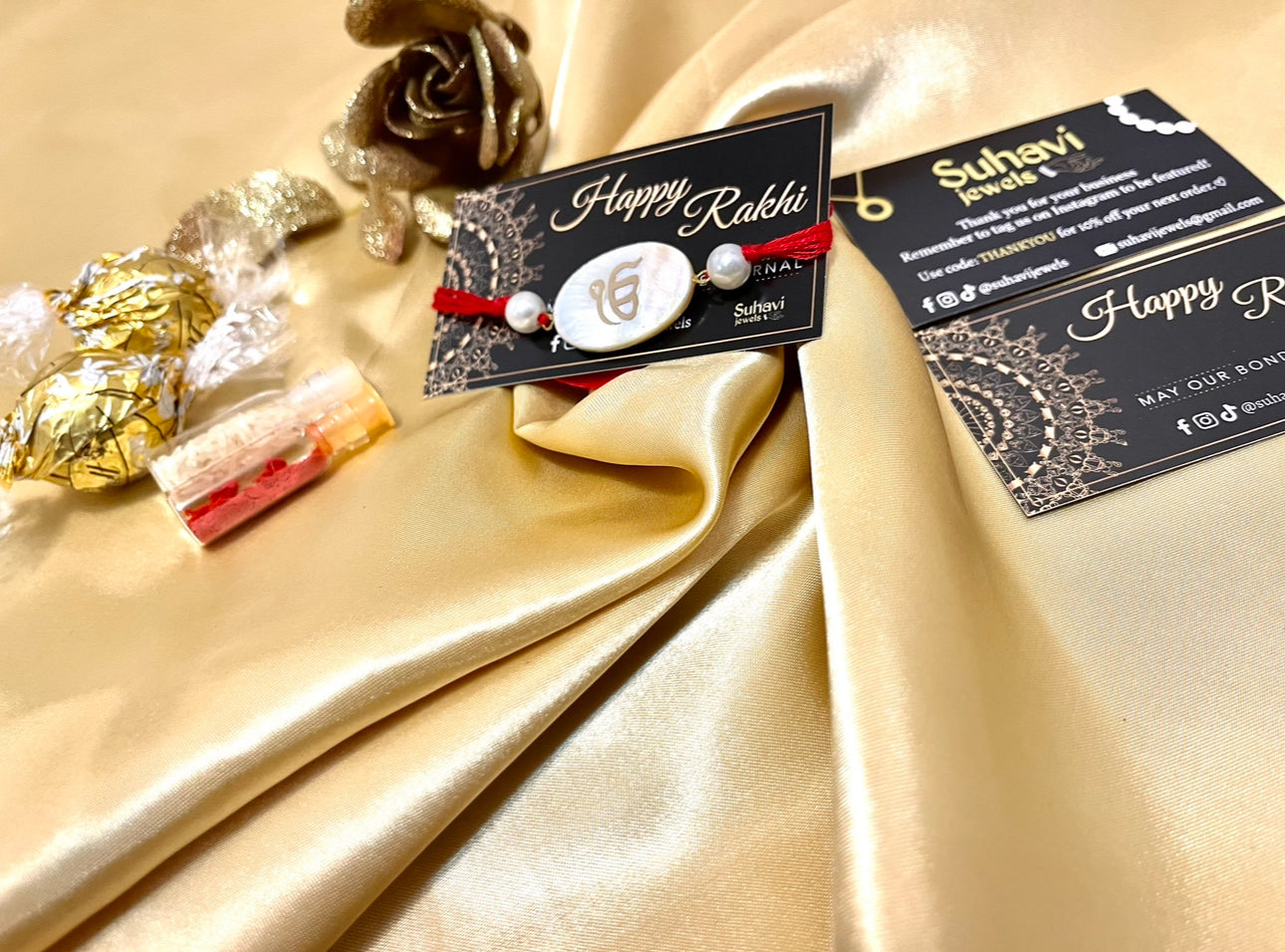 Beautiful Rakhis in Om, Khanda and Ek Onkar embossed on Shell stone and with red thread .